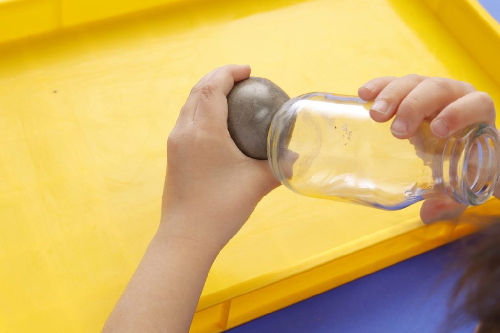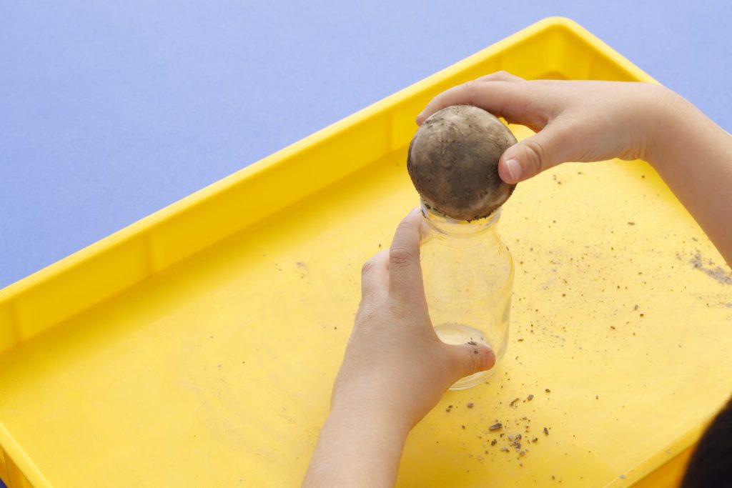どろだんごを牛乳瓶の上にのせ、瓶の口を使って凹凸を削り取ります。瓶をしっかり手で押さえ、どろだんごを手前に回すようにして形を整えましょう。