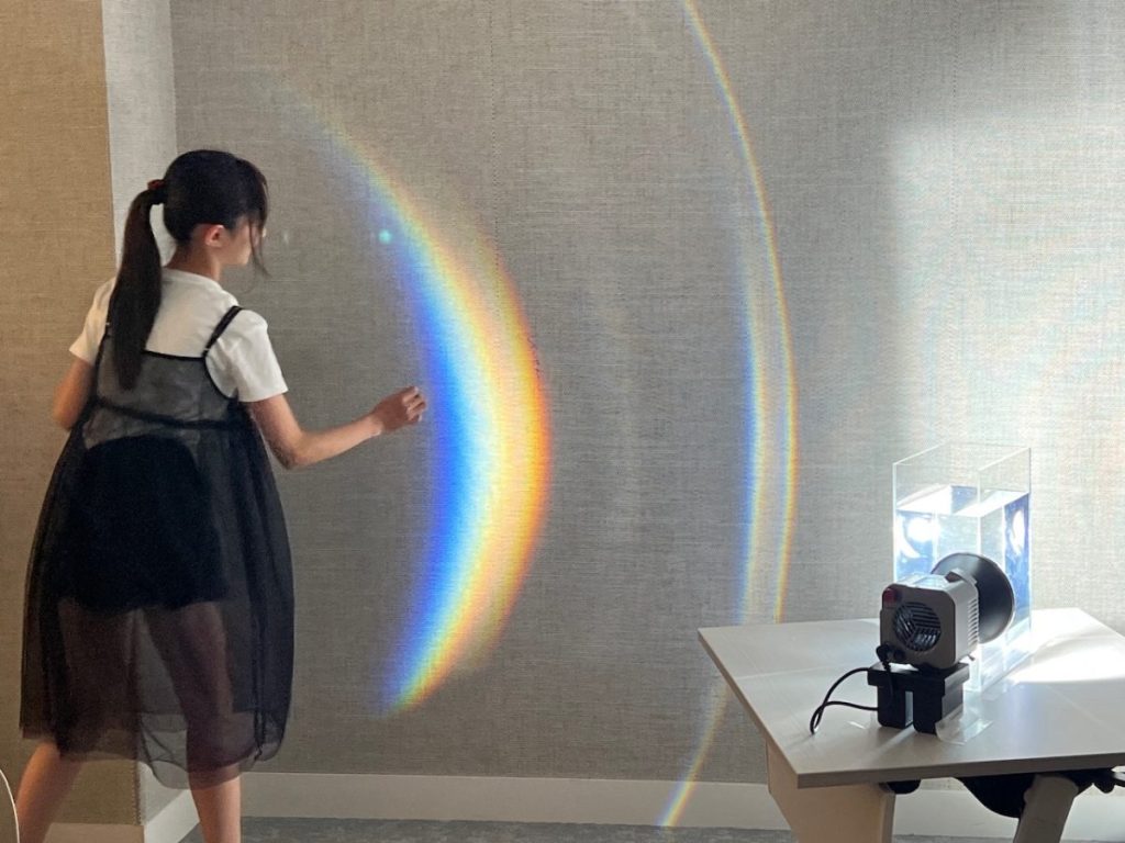 人工的に作り出した虹を見て「どこが紫外線か?」と問うコーナーでは、答えは7色の光のどの部分でもなく、一番外側の紫の外側であるということになるほど! と納得。