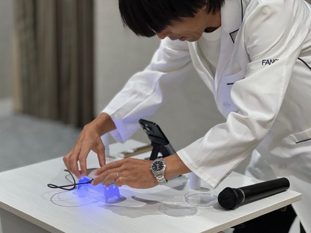 日焼け止めの効果も気になりますよね。ファンケルの研究員の方が、UVライトを当てると色が変わるビーズを使って実験をしてくれました。