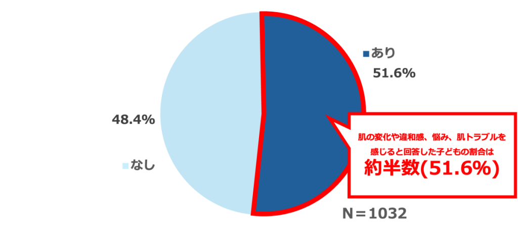さらに、5人に1人の小学生が普段からメイクをし、そのうちの約8割が肌トラブルを経験している実態が明らかに。小学生のメイク利用が高まる中で、肌トラブル率も増加することが考えられ、夏場の乾燥対策や紫外線対策がさらに重要であることが分かります。