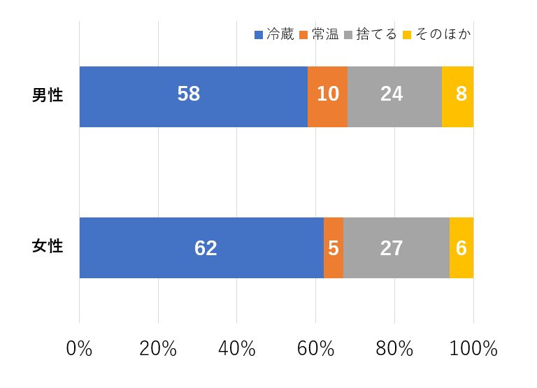 その結果、男女とも半数以上が冷蔵庫で保管すると回答しましたが、室温で保管する人も少数ながらもおり、特に男性では女性の2倍に達することが明らかになりました(図3)。