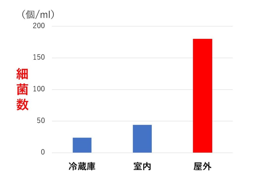 その結果、冷蔵庫で保管したものは24個/mlとなったのに対し、室内では44個/ml、屋外では180個/mlに増殖しました(図2)。