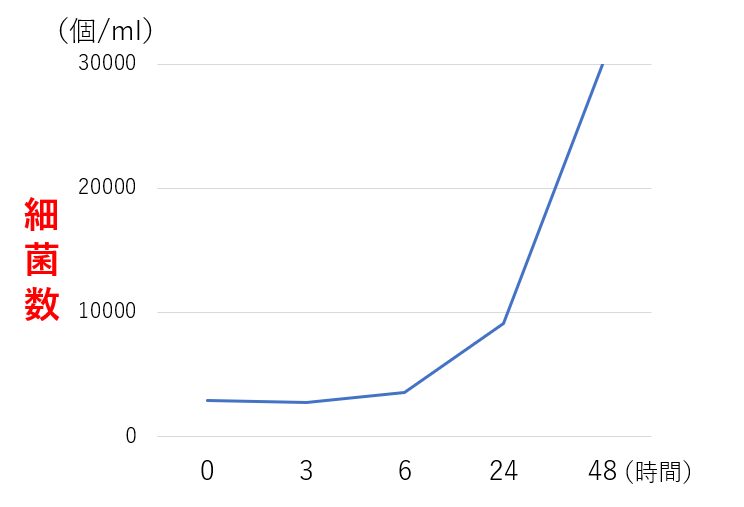 また、麦茶の菌数は24時間後には約3倍となる9100個になり、48時間後には約10倍となる30000個まで増殖しました(図1)。