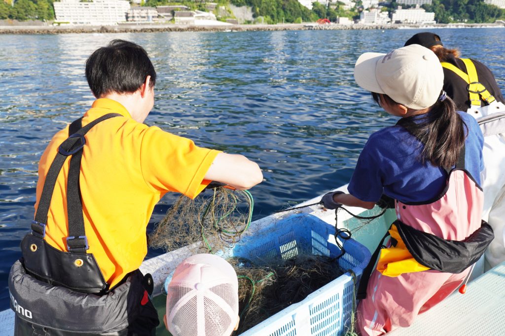 昨日と同じ乗船準備を済ませたら、いよいよ網の引き上げへ。昨日、海に仕掛けた網を引っ張るのですが…これが重労働! リゾナーレ熱海のスタッフさんと一緒に「うんしょ、うんしょ」と網を引き上げていきます。
