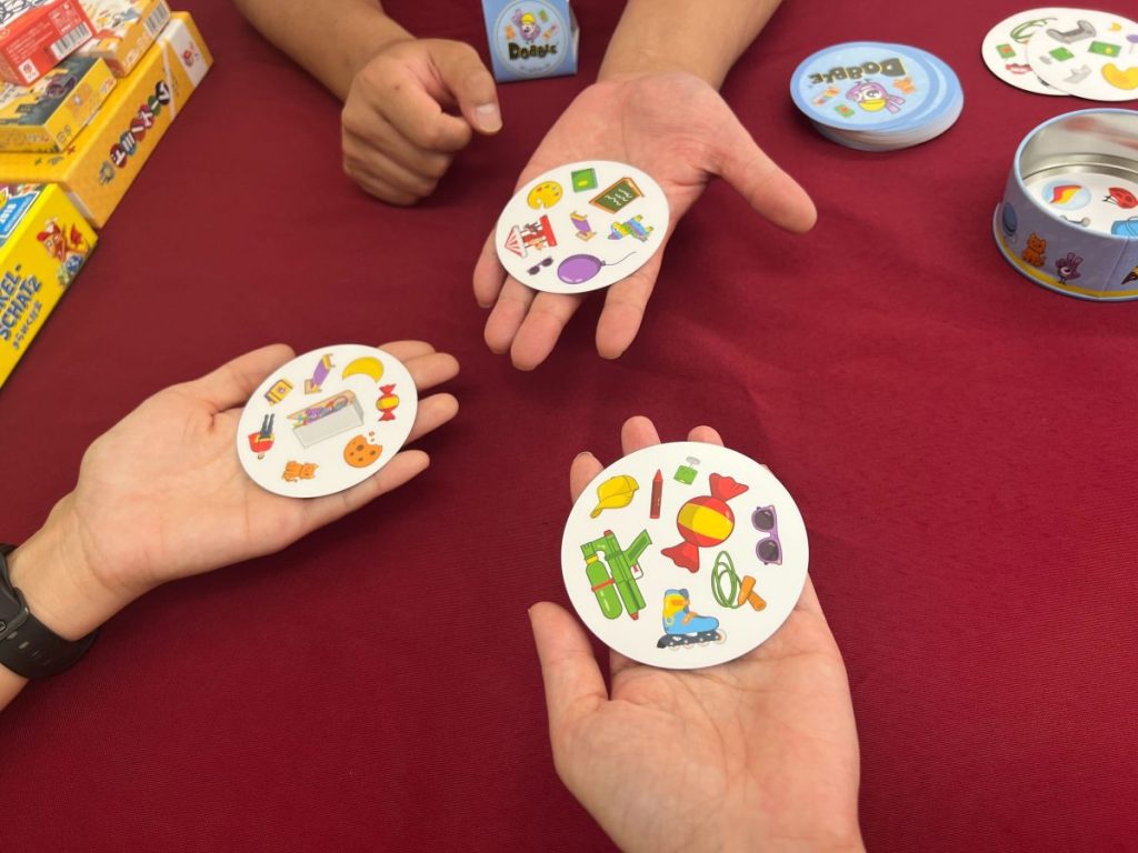 缶の中に入った55枚のカードを使って遊びます。それぞれのカードには、50種類以上あるマークの中から8つが描かれていて、すべてのカード同士に「必ず1つだけ同じマーク」が存在します。その共通するマークをいち早く見つけて宣言するのが、このゲームの基本ルールです。これが意外と大人でも苦戦し、簡単には見つからないんです。