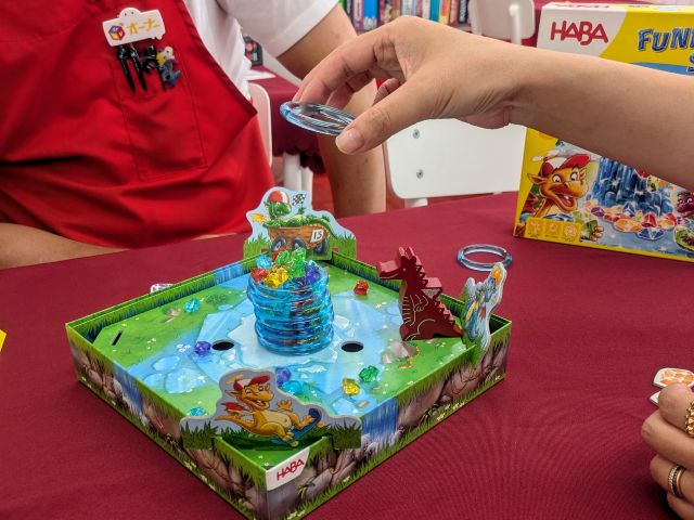 パーツがとてもかわいらしくて、見ているだけでワクワクします。恐竜が氷を溶かして宝石を落とす、という世界観も楽しくて、自分の番が来たら恐竜を動かしながら「ガオ〜!」と声を出してリングを外す、そんなやり取りに自然と笑みがこぼれます。ゲームの終盤、宝石を数えるときには、「運動会の玉入れ方式で数えましょう!」と、店主・伸居さんが声をかけてくれました。数え終わったら、一番多かった人に「おめでとう!」のひとことを。こうしたちょっとした進行の工夫で、ゲームがさらに楽しく盛り上がります。