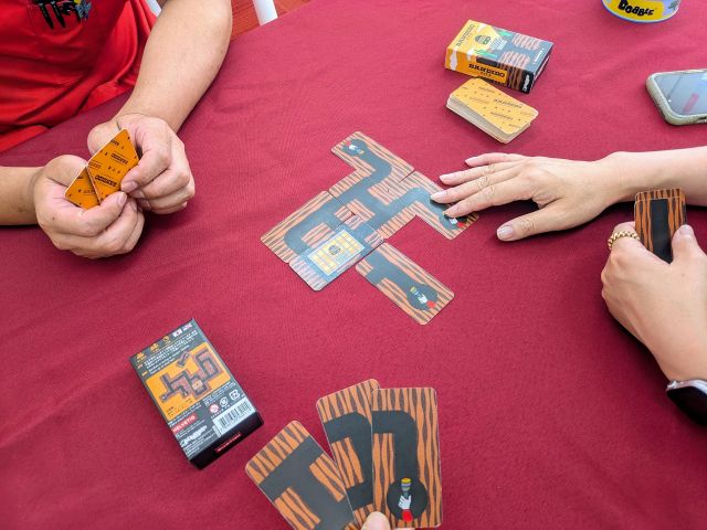 テーブル中央には、牢屋に閉じ込められた“ならず者バンディド”がいます。プレイヤーは順番に、手札から通路カードを1枚選び、バンディドから伸びる通路に道と壁が正しくつながるように置いていきます。カードを置いたら、山札から1枚補充します。〈行き止まり〉カードや、途切れた通路をつなぐ〈ループ〉カードをうまく使いながら、すべての道を封鎖します。