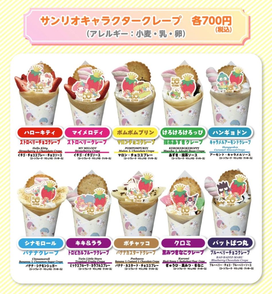 サンリオキャラクタークレープ(各700円・税込み)やハローキティの焼きドーナツ(各350円・税込み)など、かわいくておいしいメニューが充実。