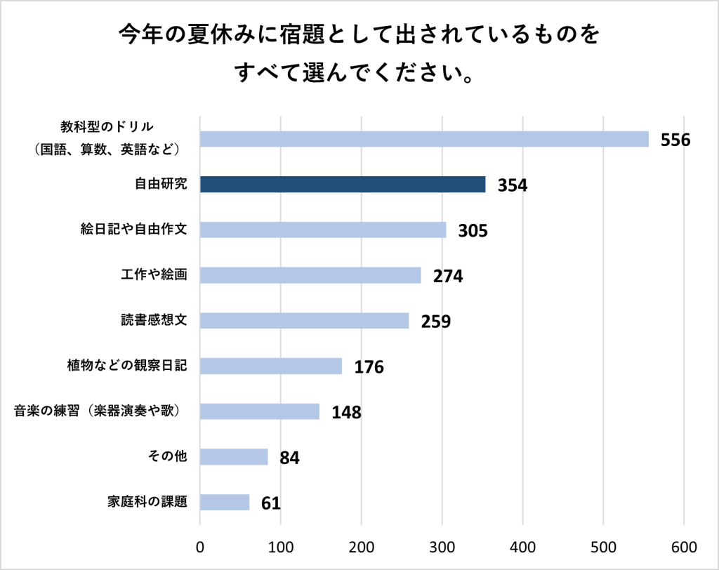 まず、今年の夏休みの宿題として、どのようなものが多く出されているのでしょうか。出された宿題の種類について尋ねてみると、上位から「教科型ドリル」「自由研究」絵日記や自由作文」の順に挙がりました。