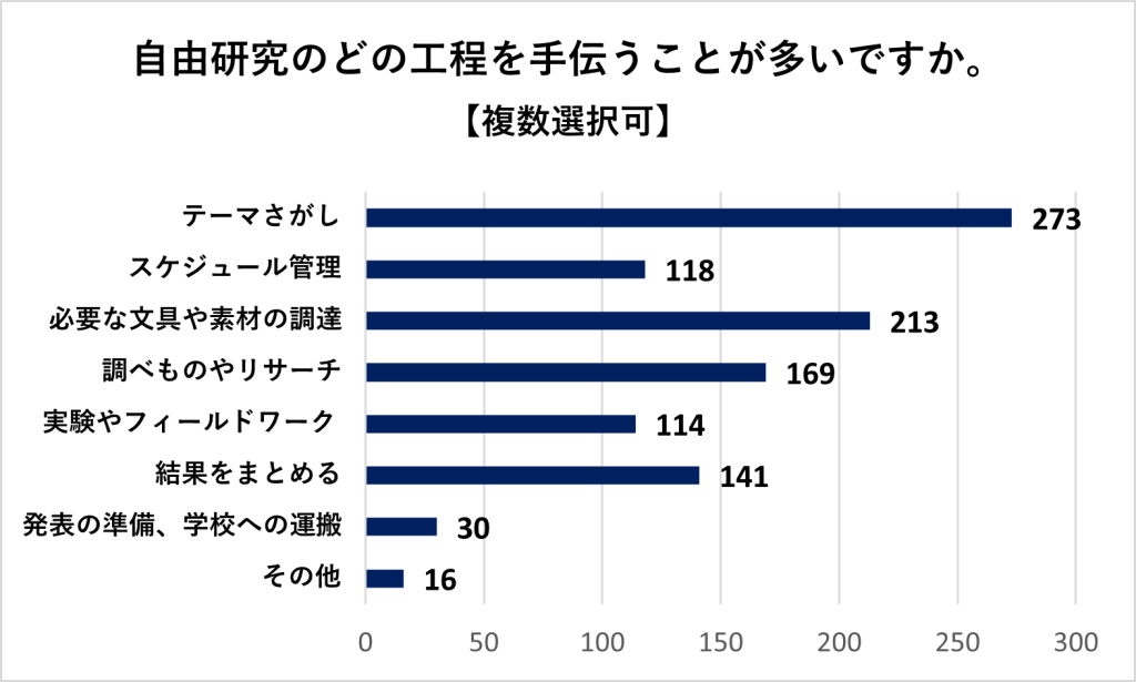 自由研究で保護者が手伝う場合に、サポートすることが多い工程としては、まず「テーマさがし」がもっとも多く挙げられています。そのほかにも「文具や素材の調達」「調べものやリサーチ」などが、上位に入りました。