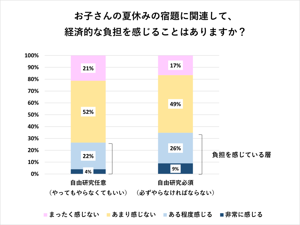 経済的な負担の有無についても、自由研究が「必須」か「任意」かでわずかに差がみられました。任意の家庭では26%が「負担を感じる」と答えたのに対し、必須の家庭では35%と、より多くの方が経済的負担を感じています。