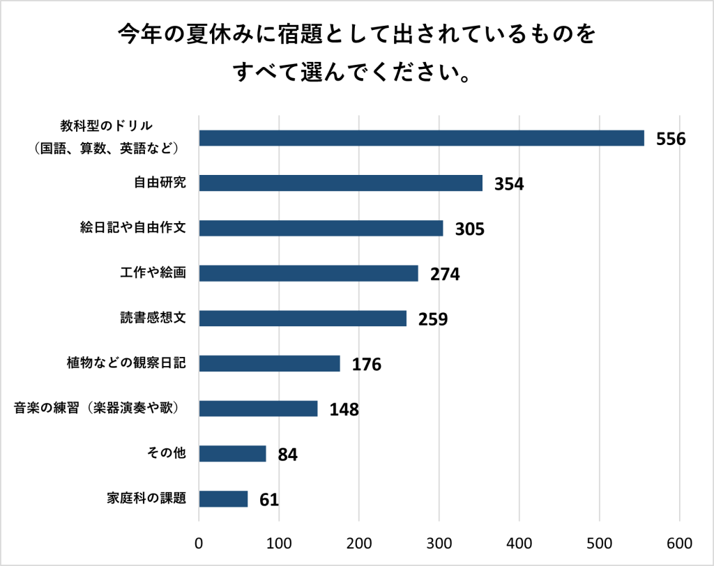 まず、今年の夏休みに出された宿題について、子どもを持つ保護者に聞いてみると、もっとも多かったのは「教科型のドリル」でした。全体の約91%の家庭が挙げており、夏休みの宿題の定番となっているようです。
