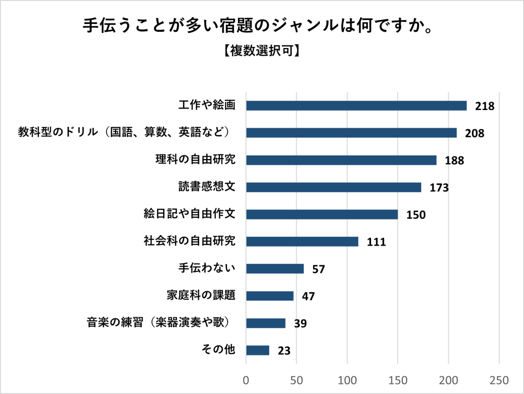 家庭で手伝うことが多い宿題のジャンルとしては、「工作や絵画」がもっとも多く、次に「教科型のドリル」「自由研究」と続きました。全体として幅広いジャンルで多くの票を集めており、実際にはさまざまな宿題で保護者がかかわっている様子がうかがえます。