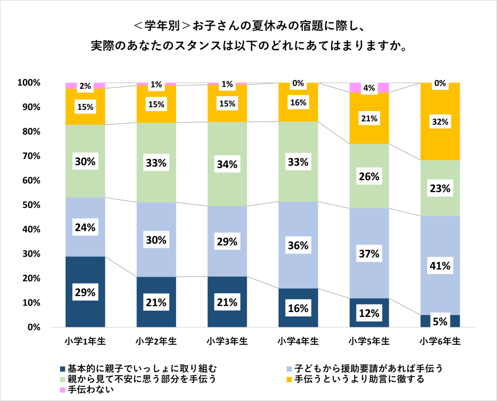 アンケート結果を比較してみると、子どもの学年が上がるにつれて「親子で一緒に取り組む」割合は減り、「援助要請があれば手伝う」「助言に徹する」というスタンスが増えていく傾向がわかりました。子どもの成長に合わせて、保護者のスタンスも自然と変わっていくのかもしれません。