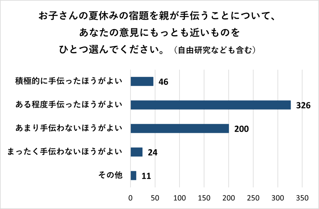 では、夏休みの宿題について、親がどのくらい手伝うべきなのでしょうか。それぞれの家庭のスタンスを尋ねたところ、「ある程度手伝ったほうがよい」と答えた人がもっとも多くを占めていました。