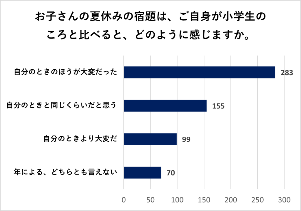 「お子さんの夏休みの宿題は、ご自身が小学生の頃と比べるとどう感じるか」については、「自分のときのほうが大変だった」と答えた方が283人でもっとも多い結果となりました。
