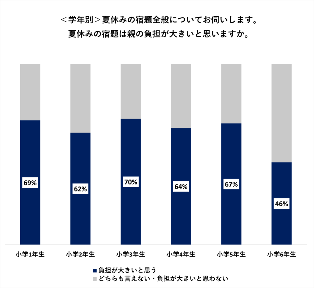 「夏休みの宿題は親の負担が大きいと思うか」という質問に対しては、小学1年生から5年生の子どもをもつ家庭のおよそ60~70%が「負担が大きい」と感じていました。一方で、小学6年生になるとその割合は約46%に減少し、親の負担感はやや軽くなる傾向がみられます。