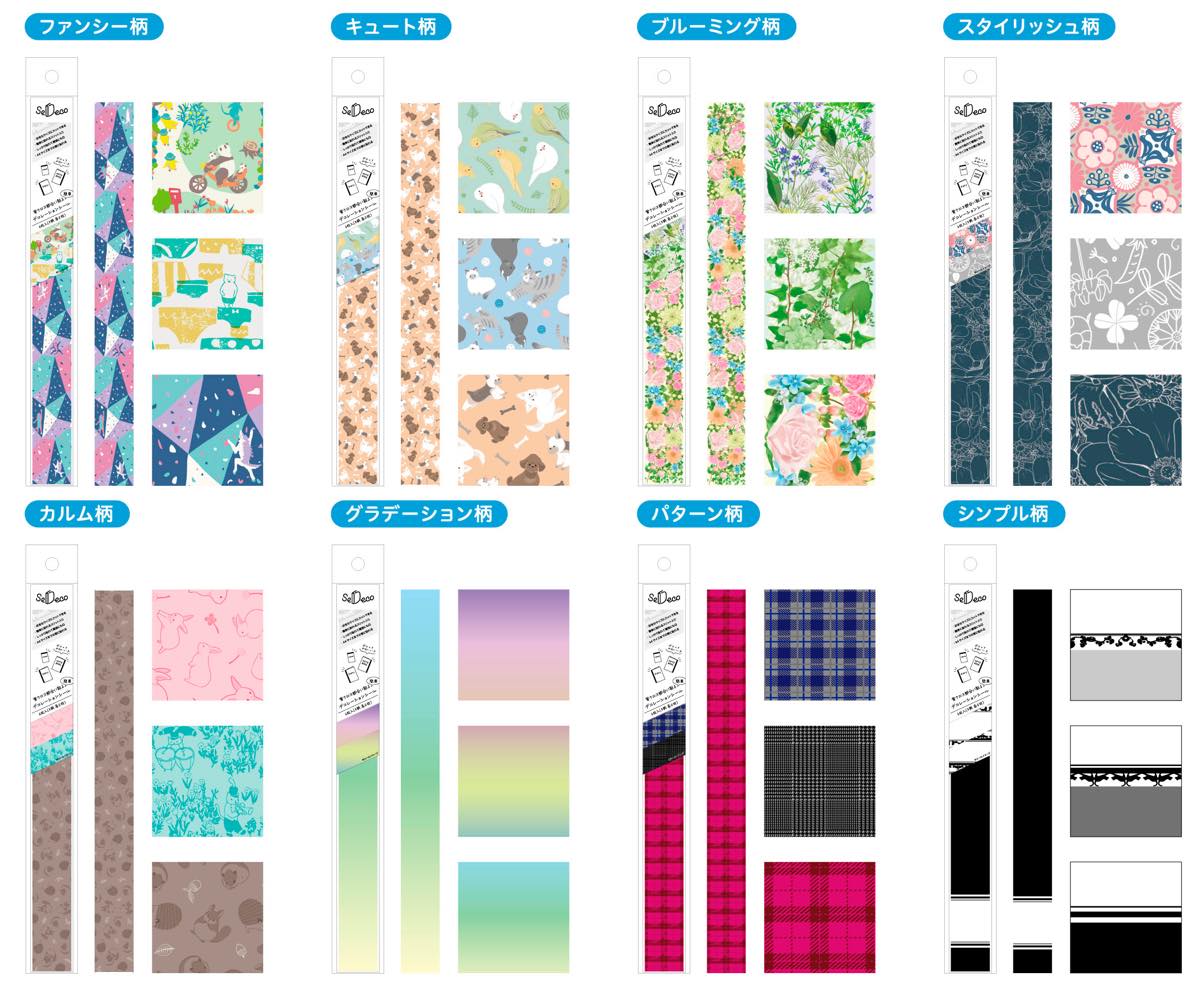 SeDecoはノートの背表紙のところについている「背クロス」という部分に貼るデコレーション用のシールです。デザインは8種類で1パッケージに3柄が各2枚入っています。
