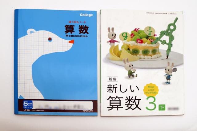 上の写真は娘が実際に使っていた教科書とノートです。どちらも「算数」ですが、色も模様も違います。またノートメーカーによっては背表紙の色が教科を問わず同じ色になっていることもあります。