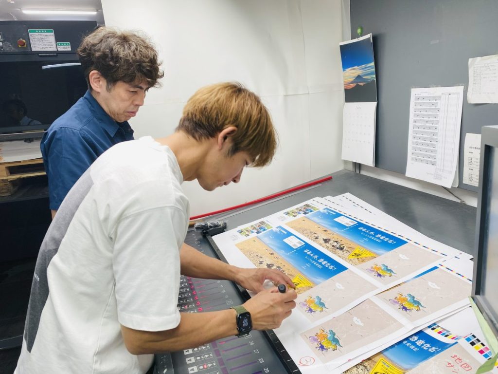 印刷されたばかりの絵本の写真をチェックするフォトグラファーの平田さん(手前)