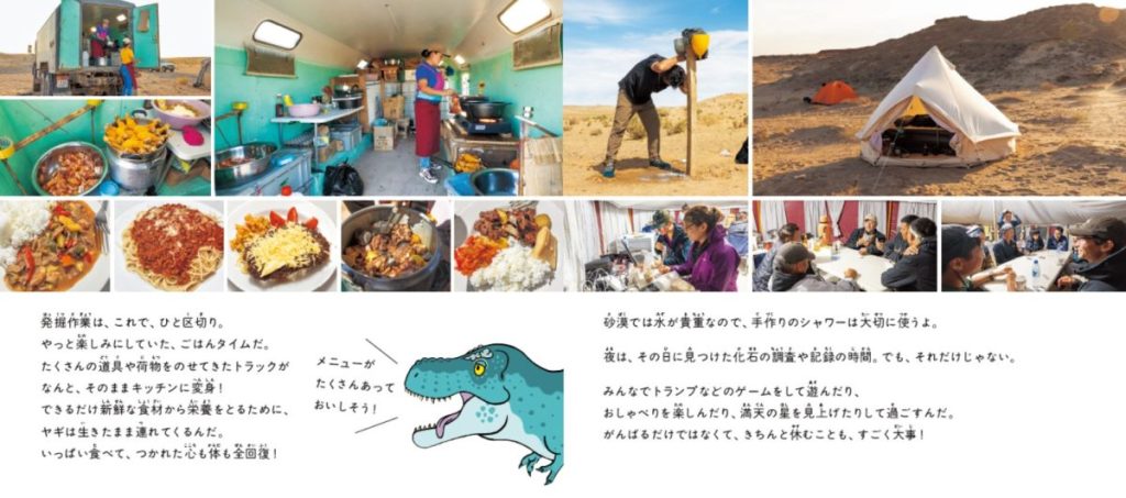 今回の絵本は、発掘を疑似体験できるというおもしろさがあります。モンゴルのウランバートルの街並みから始まり、ゴビ砂漠を走り続けて調査をスタート、その調査の風景、生活、発掘まで、読んでいる子が現場にいるような体験ができるように構成されています。