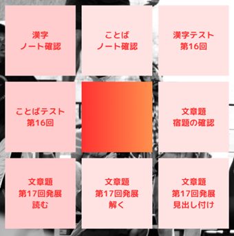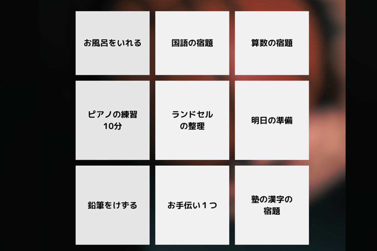 「問題集9ページ」は、3ページずつ3つの課題に分割するなど、同じ内容や教材であっても、分量が多い場合には積極的に分割するようにします。個数が増える場合は、マス目を「4×4」や「5×5」に増やすのもいいでしょう。逆に課題が9個もないときは、ボーナスとして「〇」だけ書いておきましょう。
