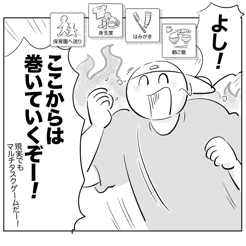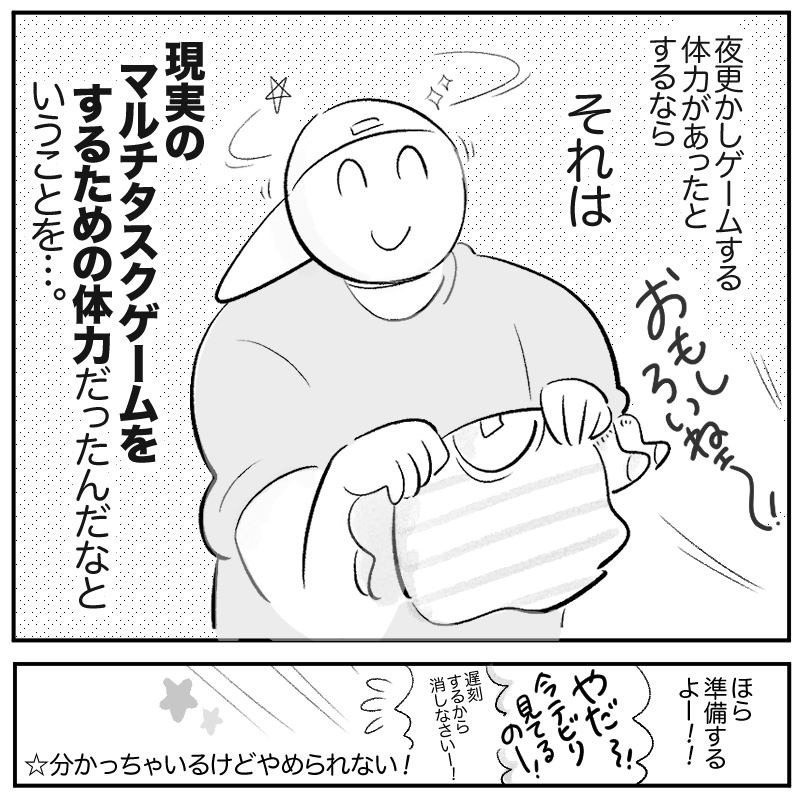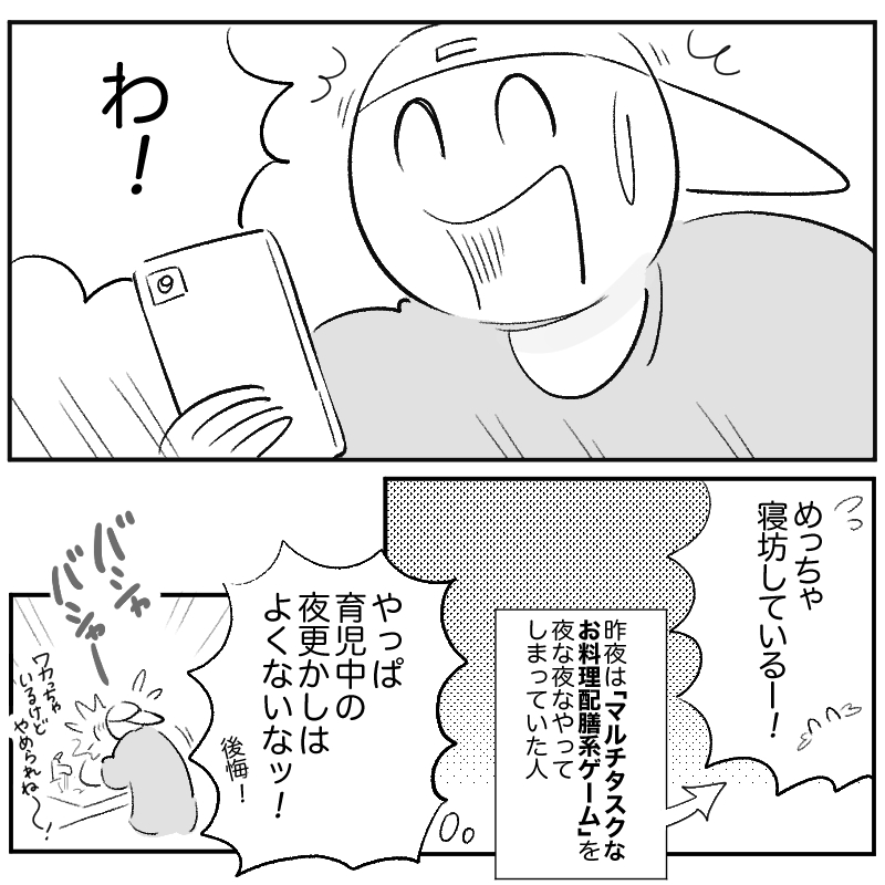 マンガ 2025.8.25 夜更かしゲームとその代償! 現実のマルチタスクゲームの過酷さよ…!【育児マンガ】 子育て中のママは、とにかく毎日が忙しくて、目が回りそう!余裕がまったくない!!という方も多いのではないでしょうか?特に年齢差が小さければ小さいほど、ママの負担は大きいもの。 そんな慌ただしい育児をハッピーに楽しんでいるまいぽーさんの日常をお届けします♪ タグ: まいぽーさんの体力気力全振り育児マンガ 寝坊した! 時間がない! そんな朝 こんにちは! 最近ゲームにハマってしまい夜更かしが続くまいぽーです! 今回はそんな翌朝のお話です。 分かっちゃいるけどやめられない!痛い目を見て、初めて睡眠ほど欠かしちゃいけないものはないなぁ〜と身に沁みる母なのでした! まいぽーさんのマンガはこちらから全話読めます! ↓↓バックナンバーはこちら!↓↓ 【プロフィール】 まいぽー 夫・長男・長女・次女・三女との6人暮らし。 毎日がお祭り騒ぎ。