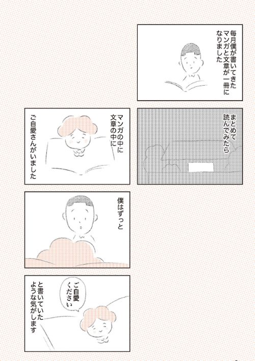 矢部さん:連載をまとめるにあたって、改めてこれまで描いてきたものを読み返してみたんです。そうしたら、自分自身に向き合いながら描いてきた作品なのですが、そのどれもが手紙の最後に相手に向けて「ご自愛ください」と、ひと言添えるような気持ちで描いてきたような話だなと思ったんですよね。それで、『ご自愛さん』というタイトルにさせていただきました。