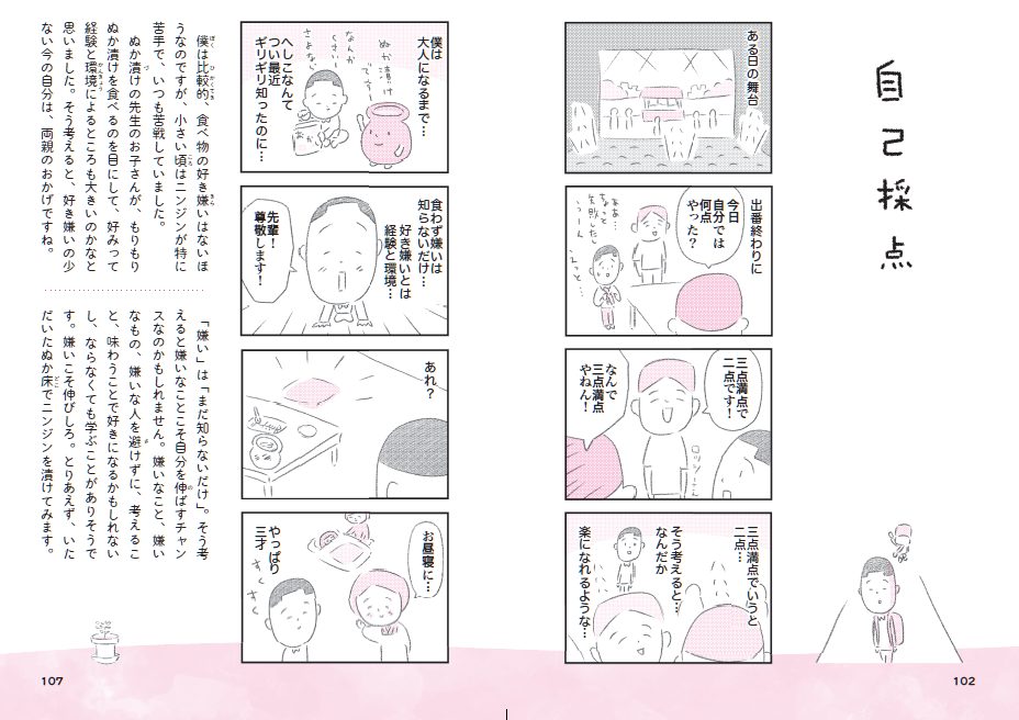 矢部さん:ウ~ン、難しいですね……。それはなかなか……。あえて選ぶなら、「自己採点」でしょうか。舞台の出番が終わったあと、その日のできばえを100点満点ではなく、3点満点でざっくり自己採点している先輩芸人の方の考え方がすごくいいなと思って、そのエピソードをそのまま描かせていただいているんです(笑)。