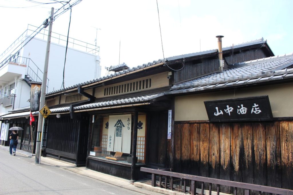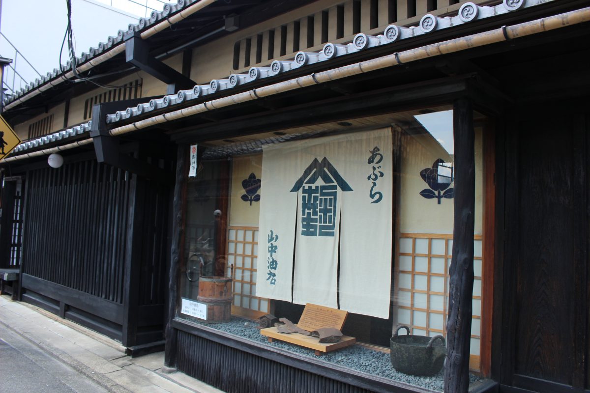 二条城の北側にある「山中油店」は、食用、建築用、美容など、あらゆる油が揃う全国的にも珍しい油の専門店です。