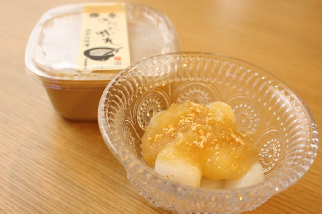 8.器に白玉団子を入れ、上から西京白味噌たれをかけ、お好みできな粉をかけたら完成です。