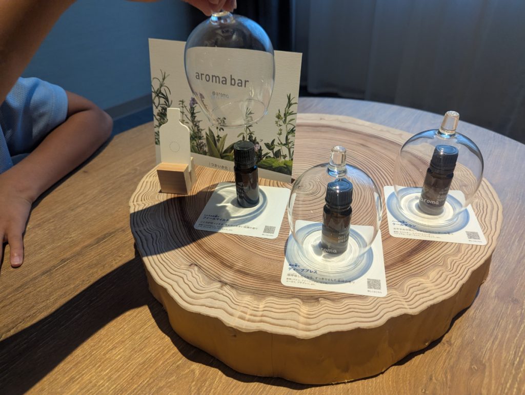 アットアロマの「アロマバー」では、上質な睡眠をサポートする100%天然のアロマシリーズ「スリーピングサポート」から3種類の香りが用意され、子ども自身が好きな香りを選んで客室内で楽しめるようになっています。