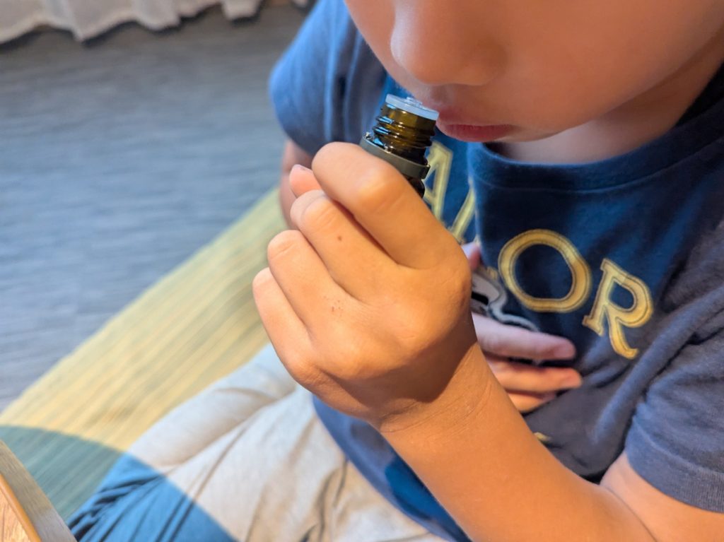 こちらを紙にひとたらし。枕元に置いておくと、ベッドに横になっているときにほのかに香ってきて、「あ! オレンジの香りする~」と子どもたちも上機嫌でした。