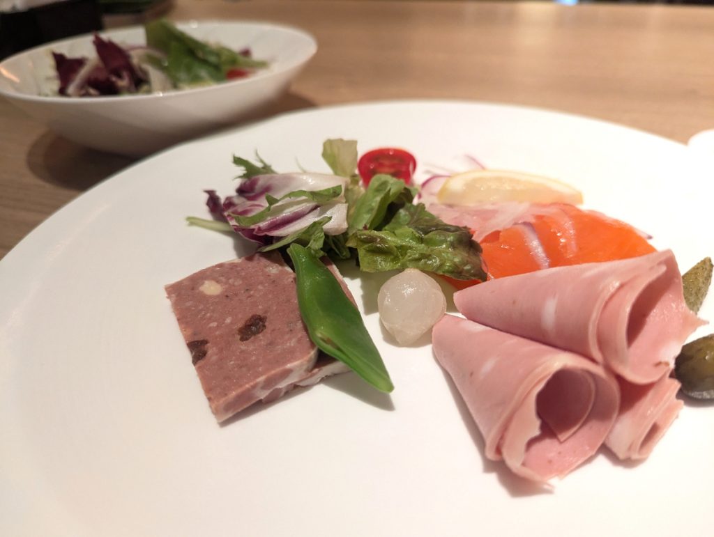 自家製白馬豚ロースハムや白馬村産信州サーモン、信州産チキンコンフィなど、地元の食材をたっぷりと味わえます。黒いかたまりのように見えるものは、紫米を海苔で巻いた海苔巻き。おにぎりが大好きな次男はこちらにハマっていました。