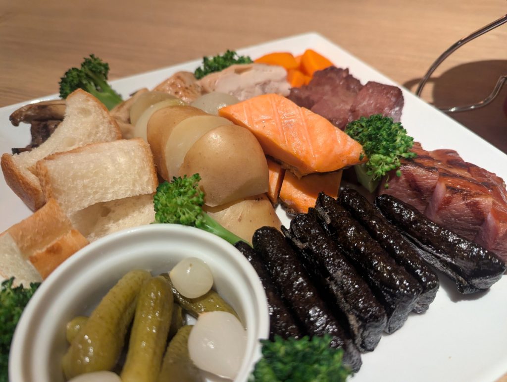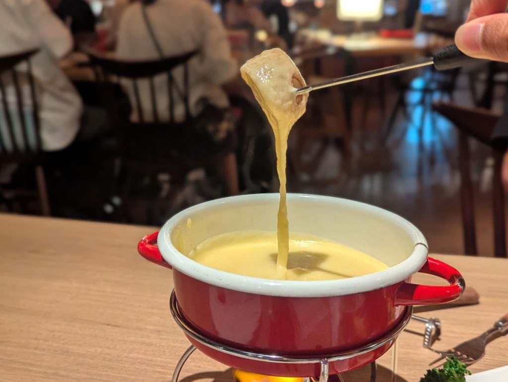 一日を締めくくる夕食にも工夫が凝らされています。メインとなるのは、信州食材を豊富に使った地産地消のチーズフォンデュ。