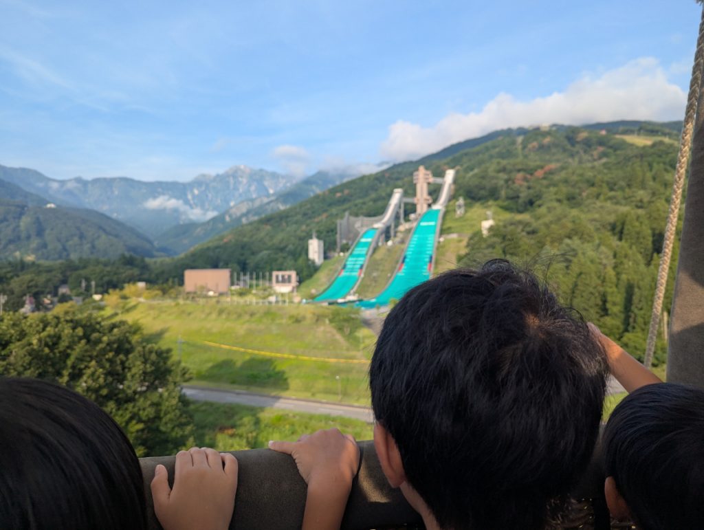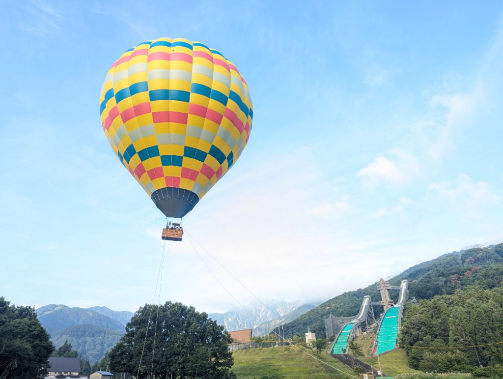 気球のカゴに乗り込んで、バーナーの火がふくとどんどんと上昇していきます。上空から見下ろすのは、1998年に長野で行われた冬季オリンピックのスキージャンプ台。周囲に何もさえぎるもののない開放感たっぷりの景色が楽しめました。