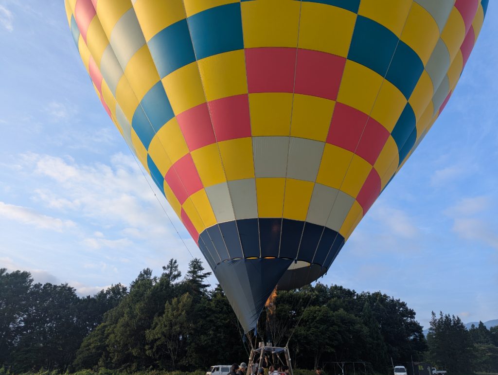 熱気球は放っておいたら山の向こうまで飛んで行ってしまうので、四方向から車で引っ張ってコントロールしていました。間近で見るとかなり大きくて迫力があります!
