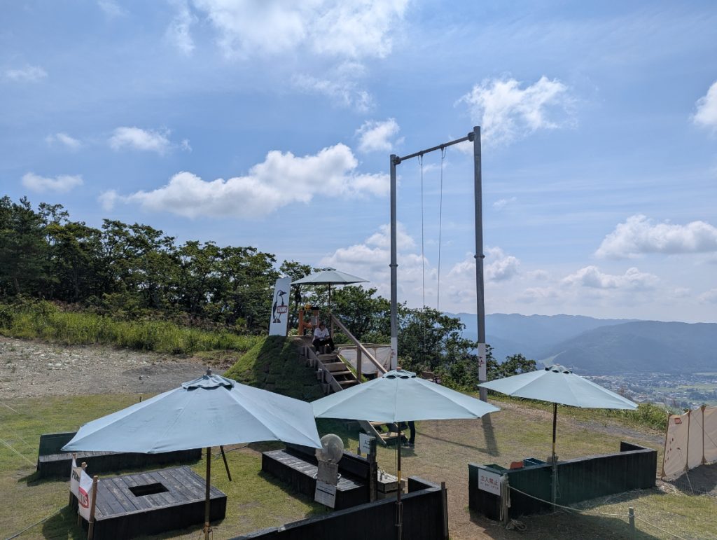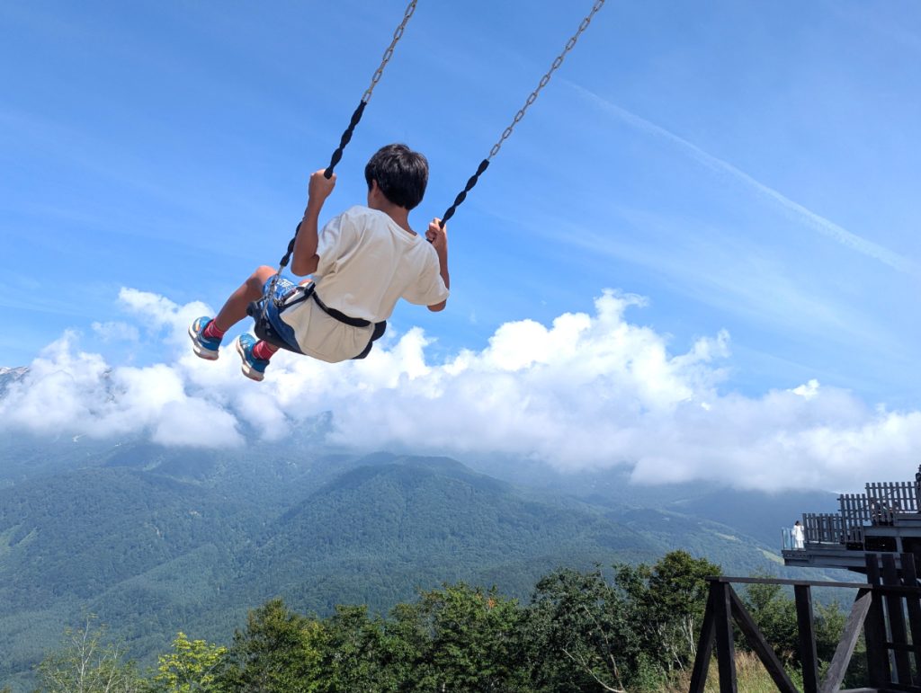 岩岳ゴンドラリフトに乗って到着する山頂エリアにある「ヤッホー!スウィング」。こちらは、身長110cm以上であれば体験できます。