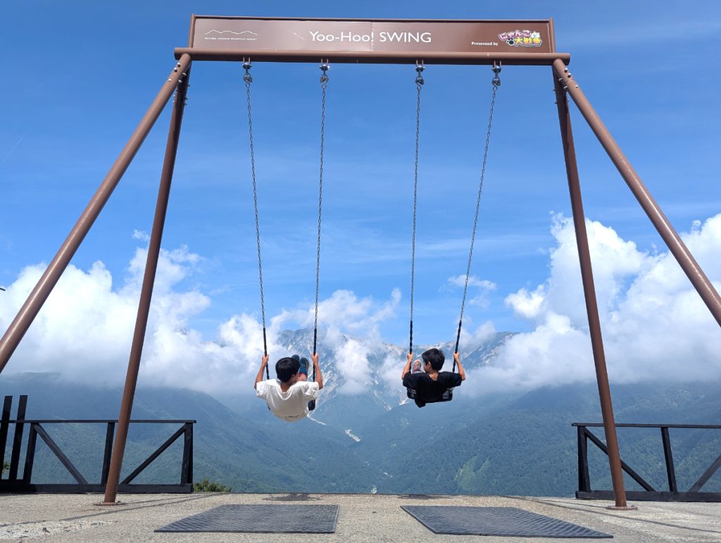 さらに、絶景スポットはもちろん、トレッキングやマウンテンバイクなどが楽しめる「白馬岩岳マウンテンリゾート」へ。こちらで、北アルプス白馬三山を正面に臨む写真映え抜群の大型ブランコ「ヤッホー!スウィング」体験ができます(11時~12時の時間帯のみ)。