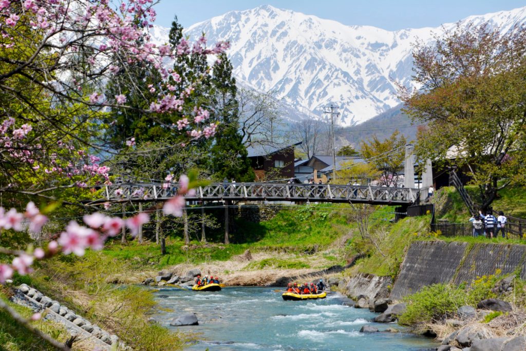 白馬村を流れる一級河川「姫川」は水質のきれいさでも知られる透明度の高い川。コースのほとんどが浅い場所なのでボートがひっくり返ったとしても足がつくほどですが、流れの激しいところもあり、エキサイティングな体験ができます。