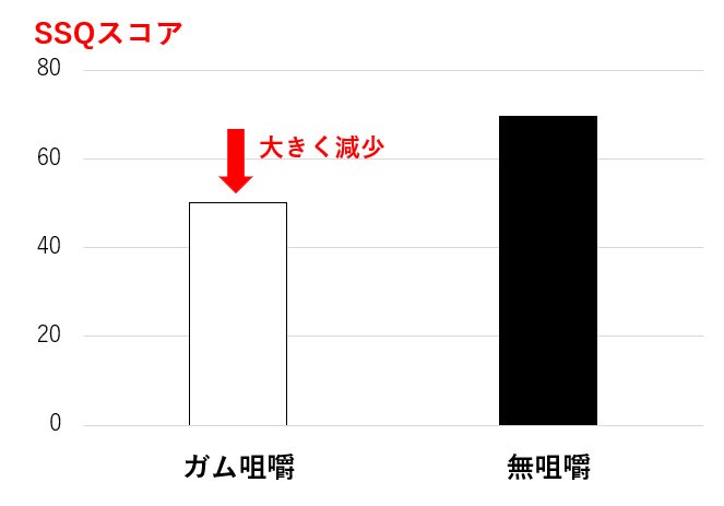 また、走行開始前と走行終了後で比較した質問票(SSQ)による「ふらつき感」のスコアでは、ガムを咀嚼したグループのほうが有意に低くなることが分かりました(図3)。