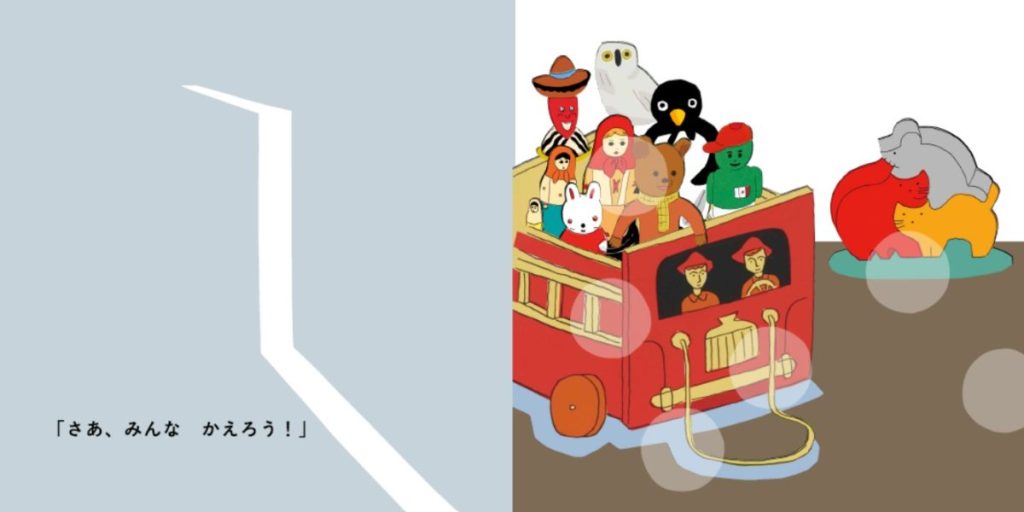 例えば、絵のフクロウの目が光っているのを見て、親子で「フクロウって夜は目が光るんだよ」というような会話をしてもらったり、「夜寝てる間におもちゃの世界があるかもしれない」というような想像の世界を、絵本を通していろんな方と共有していってもらえたらと思います。
