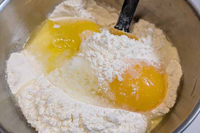 【2】ゴムベラを使って、くぼみの中の卵を少しずつ強力粉と混ぜ合わせます。