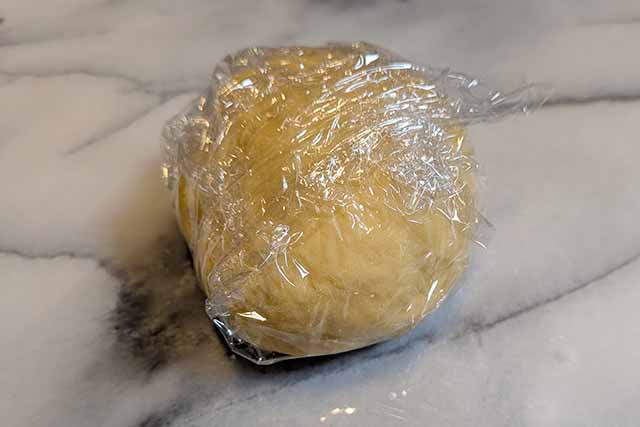 【4】生地をラップでしっかりと包み、冷蔵庫で30分ほど休ませます。