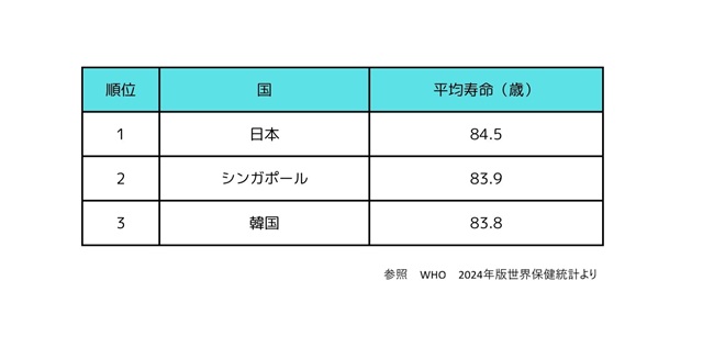 では、他の国々の状況はどうでしょうか。世界保健機関(WHO)の2024年版世界保健統計によると、男女合わせた平均寿命の1位は日本が84.5歳、2位はシンガポールで83.9歳、3位は韓国で83.8歳と、アジアの国々が上位を占めています。