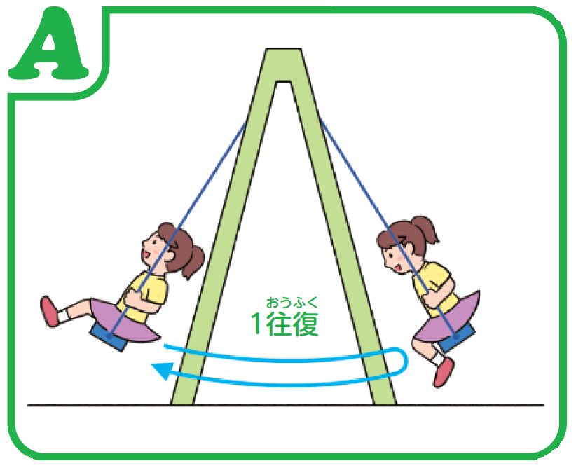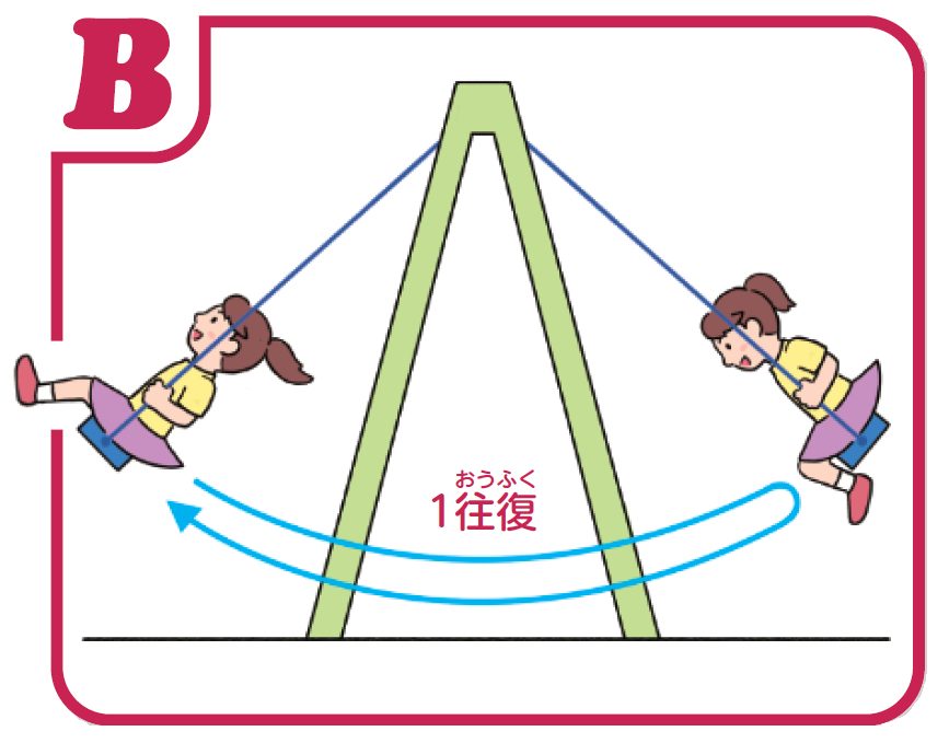 AとBは同じ女の子が同じブランコに乗っているイラストです。Aは小さく揺れ、そしてBは勢いよく大きく揺れていますね。