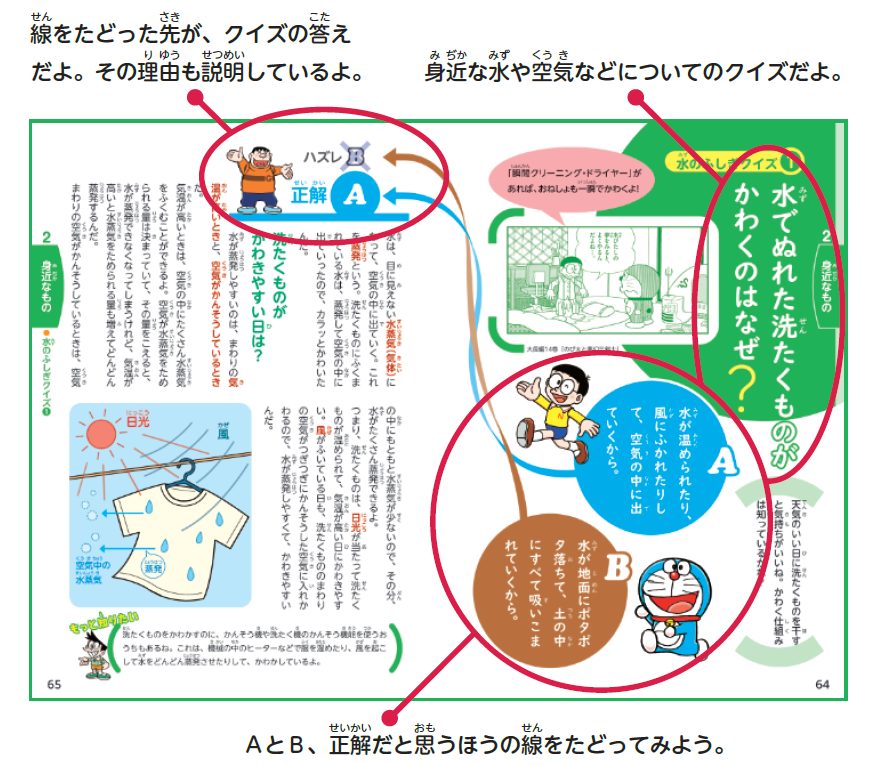 「水で濡れた洗たくものがかわくのはなぜ?」というクイズにはAとBの2つの答えを用意。線をたどった先にあるのは、正解か、ハズレか? ドラえもんたちとともに、本を見ながら親子でわくわくクイズが楽しめます。解説文にある「水蒸気」「日光」など大事な語句や、重要なポイントについては赤い文字で紹介されています。