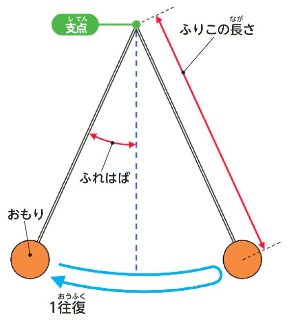 下のイラストのように糸や棒におもりをつけた振り子が1往復するのにかかる時間は振り子の長さによって決まります。振り子の長さが長いと、1往復する時間も長くなりますが、振り子についているおもりの重さや振り子の振れ幅が変わっても、振り子が1往復する時間は変わりません。