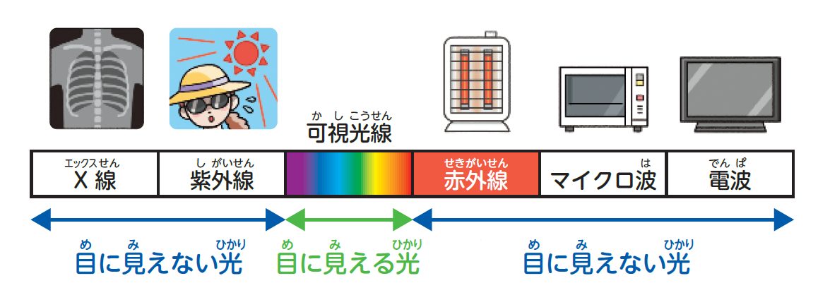 電気こたつの中が赤く光っているのは、赤外線が赤く見えるからではありません。じつは赤く光る必要はないのですが、赤く光っていたほうが、人が温かく感じるからです。