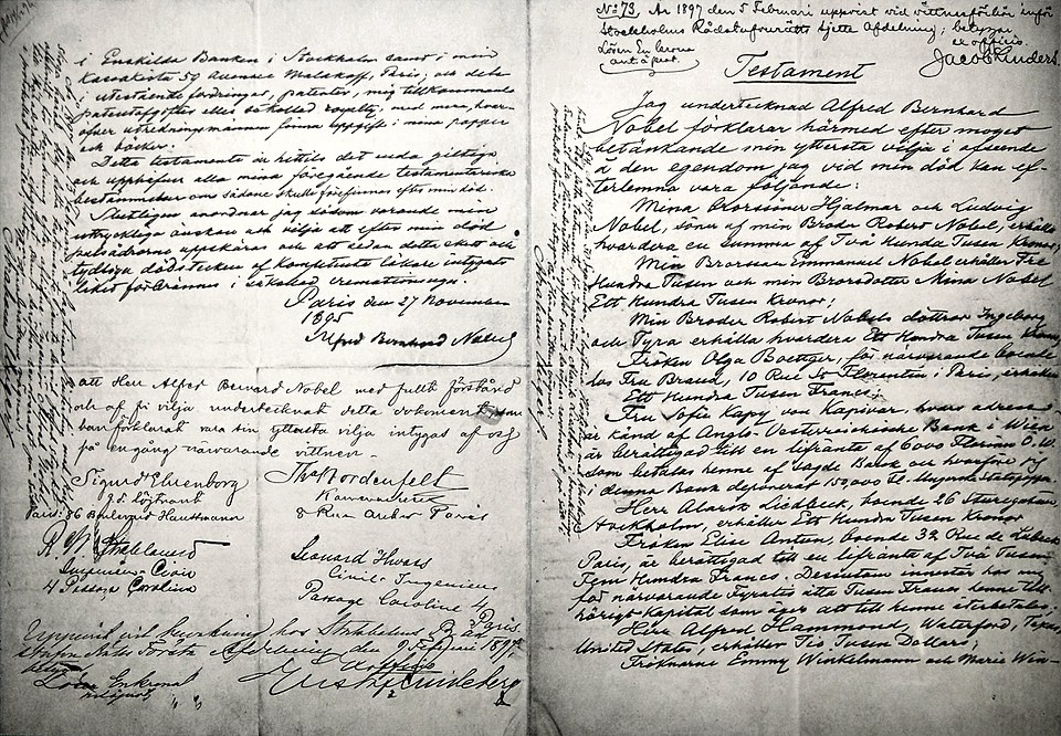 ダイナマイトの軍事利用で巨額の富を得たノーベル氏は、やがて「死の商人」と呼ばれるようになりました。この事実にショックを受けたノーベル氏は、自身の財産を人類のために使いたいと基金を立ち上げ、人類に貢献する発見をした人に配分するとの遺言を残したと伝えられています。